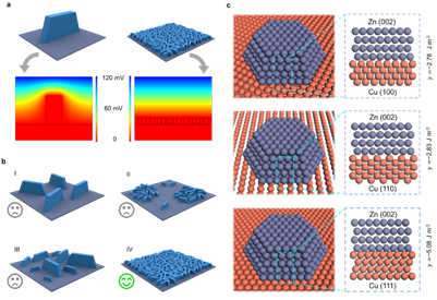 受中国上古神话——“大禹治水”中“堵不如疏”思想的启发,抑制枝晶的自我放大效应,合理地调节它们的生长,而不是完全阻碍它们的形成,可能是提高金属阳极稳定性的一种更为有利的动力学途径。具体而言,如果电极表面存在大量微小的、大小相似的、均匀分布的枝晶,其充放电时周围电场不会明显变化。同时,大量枝晶的生长相互竞争,可以有效避免单个枝晶的异常长大。因此,金属的重复电镀/剥离只会导致树枝状物的均匀长大和缩小,而非形成有害的大枝晶。