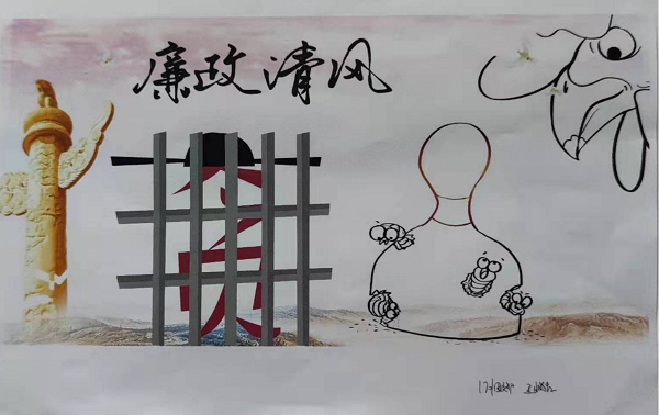 作品简介:图中人物左边是一桶清水,表现的是清廉的“清”字,右边是一把镰刀,表现的是清廉的“廉”字,人物站在以“清廉”为形的桥上。即清水把走过桥上污浊的人洗净,镰刀铲去歪风邪气。