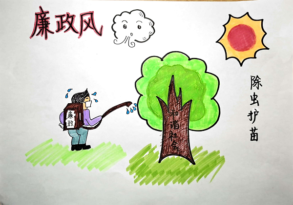 作品简介:图中的人物拿着除虫喷雾正在对树木进行除虫,此时“天朗气清,惠风和畅”。所用的喷雾为“廉政”。只有清正之风,才能畅快人心,以廉政进行浇灌既能除去歪风邪气,更好的建设我们的和谐社会。