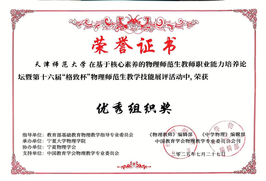 7月25日至27日,基于核心素养的物理师范生教师职业能力培养论坛暨第十六届“格致杯”全国物理师范生教学技能展示与交流活动在宁夏大学举行。本次活动吸引全国百余所高校参与,yl永利集团官网登录师生表现突出,共斩获包括“优秀组织奖”在内的11项荣誉,其中温熙雅包揽教学技能展示、创新实验设计与自制教具双项一等奖,陈楷月、侯家瑞、于佳灵、张欣4位同学在两项赛事中均获二等奖。