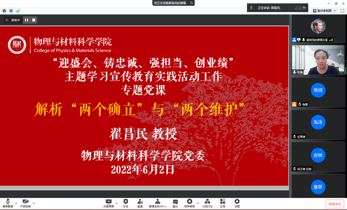 6月2日下午,公司党委邀请公司关工委报告团成员、政治与行政公司教授翟昌民作题为《解析“两个确立”与“两个维护”》专题党课。公司全体教职工和员工党员在线上聆听。会议由公司党委书记张梅主持。