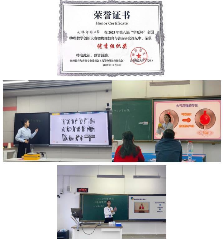 近日,第八届“华夏杯”全国物理教学创新大赛暨物理教育与普及研究论坛在云南师范大学举行。经过紧张激烈的比赛,yl永利集团官网登录2021级物理师范生施芷妍、刘睿祺、李雅杰表现出色,均斩获一等奖。其中,施芷妍同时获得“实验创新奖”,并获推参与创新教学大赛优秀作品展示。公司荣获“优秀组织奖”。
